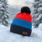 Attractive knitted beanie with colourful design and cute bubble on the top. To provide your ears with comfort and warmth, we have made an inner fleece zone.